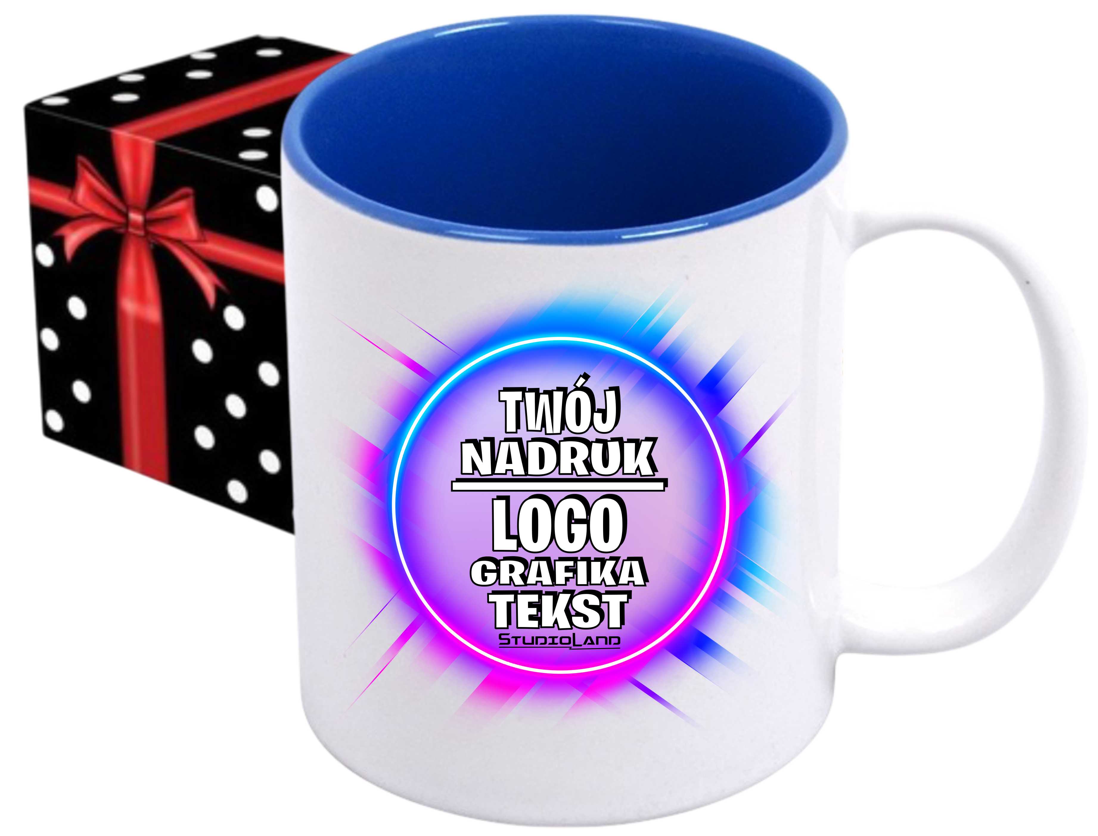 Foto kubek ze zdjęciem wnętrze JASNONIEBIESKIE personalizowany Napis Logo Grafika pudełko GRATIS