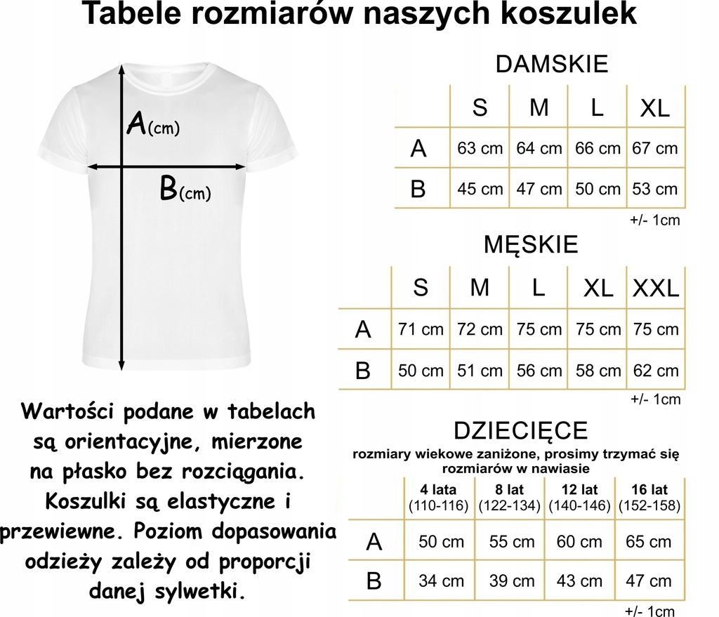 ➡️ Możliwość zakupienia dowolnego rozmiaru z tabeli - można dodać do koszyka kilka koszulek i podać kilka rozmiarów damskie, męskie, dziecięce, każda koszulka jest w tej samej cenie !
